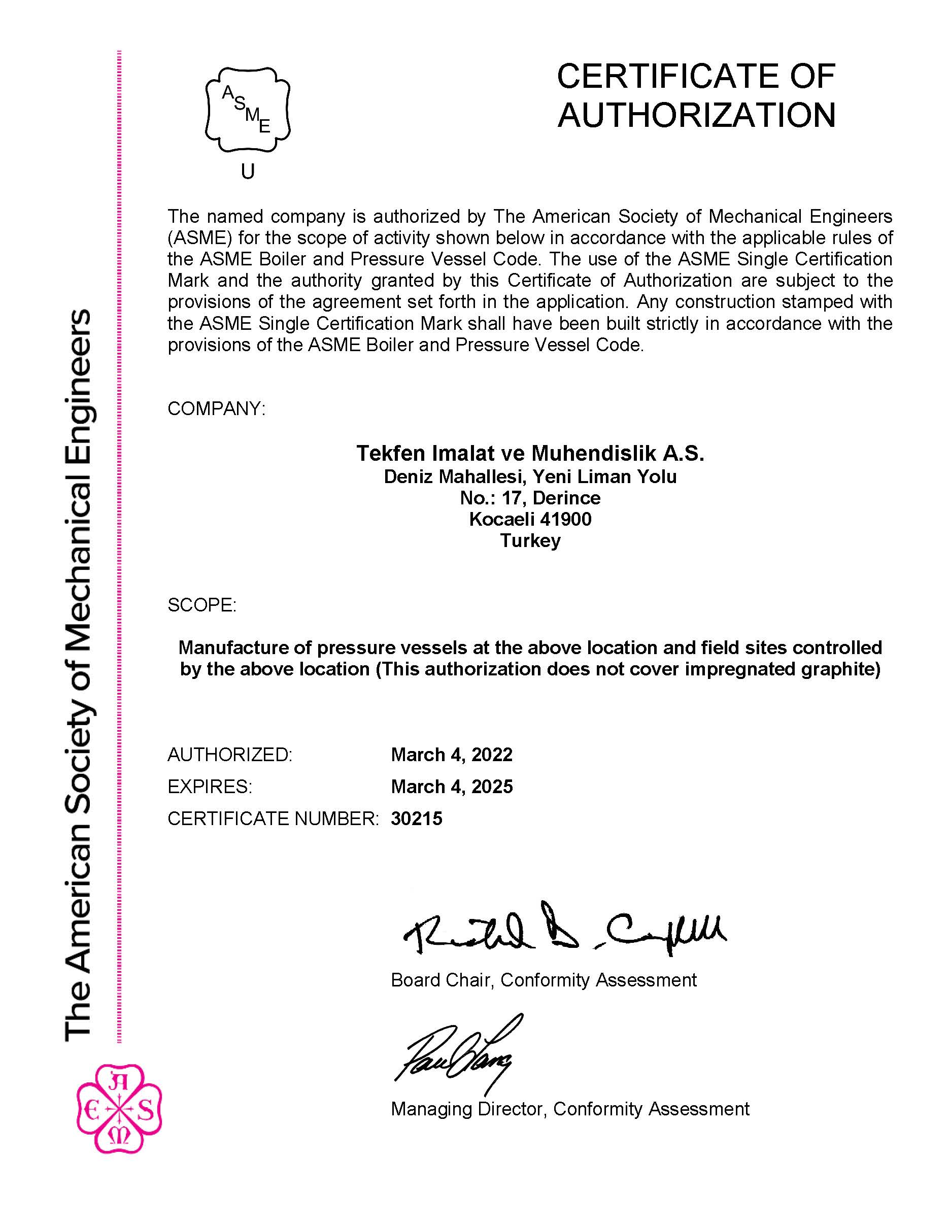 ASME CODE SAUTHORIZATION " U" SYMBOL STAMP